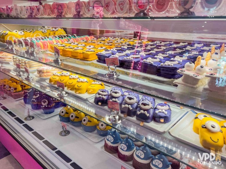 A Bake My Day é a mistura de uma lojinha com uma confeitaria. Ali você tem alguns produtinhos temáticos de Minions, como pelúcias, roupas e copos, mas também acha várias opções de docinhos inspirados no filme. Tem biscoitos, s’mores, cupcakes, cake pops, macarons, tortas whoopie e por aí vai.