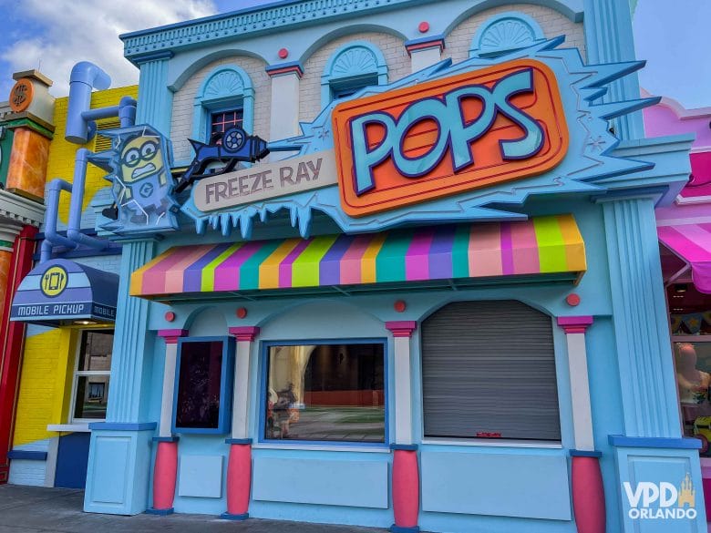 Na Freeze Ray Pops você encontra várias opções de sabores de picolés, todos temáticos e bem coloridos. Tem um inspirado no Gru, nos Minions e até no Vector. Inclusive, o picolé dos Minons é de banana e um dos mais procurados por ali.