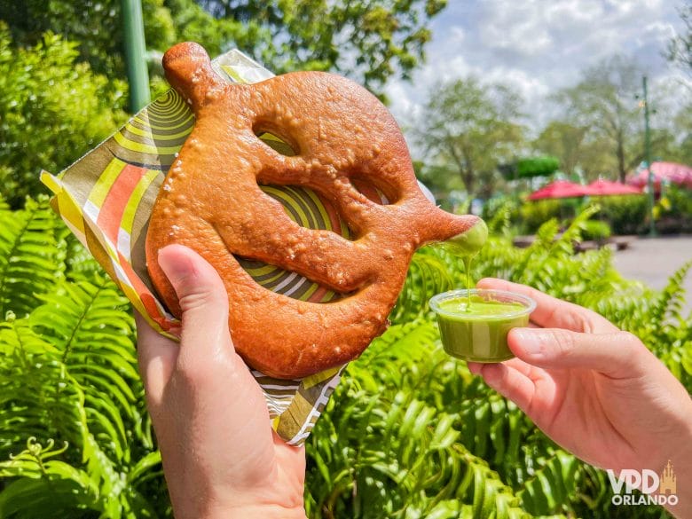 O outro quiosque da área da DreamWorks que vende vários lanchinhos rápidos, como um waffle salgado e cachorro quente. O item mais conhecido aqui é o pretzel do Shrek, que vem acompanhado de um queijo verde. Mas, eu não indico comer não, viu? Pra mim, não vale a pena e é bem ruim.