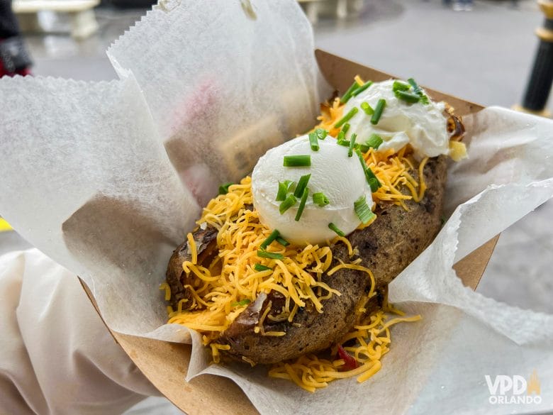 Dica extra: logo na saída do Beco Diagonal, você encontra um quiosque que vende baked potatos – ou, batatas recheadas, na tradução para o português. Eles têm várias versões diferentes, mas a clássica com queijo, bacon e sour cream é a minha favorita. Ela é bem grande, então dá super para dividir ou usar como uma refeição mesmo.
