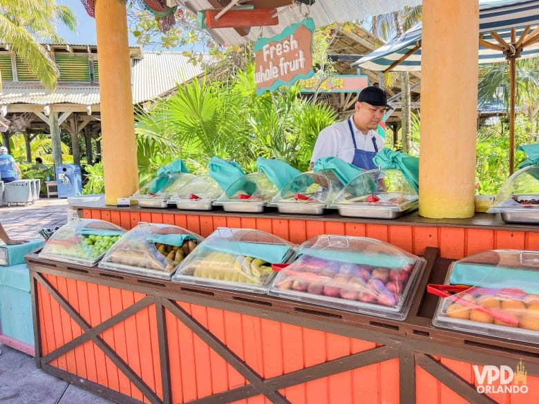 Assim como no navio, em Castaway Cay você vai encontrar restaurantes no formato buffet, onde você pode se servir à vontade e sem precisar pagar nada a mais por isso. Em geral, o almoço é servido das 11h às 14h, mas você consegue checar o horário certinho no aplicativo da Disney Cruise Line ao longo da sua viagem.