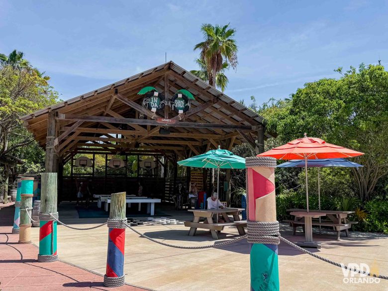 Depois desse primeiro restaurante, fica o In-Da-Shade, um espaço na sombra para jogos, que pode ser usado por todo mundo, mas muitas vezes oferece atividades organizadas com foco nos pré-adolescentes, que não tem um espaço dedicado só pra eles como as crianças e os adolescentes mesmo. Tem ping-pong, cestas de basquete e até uma quadra de vôlei de praia.