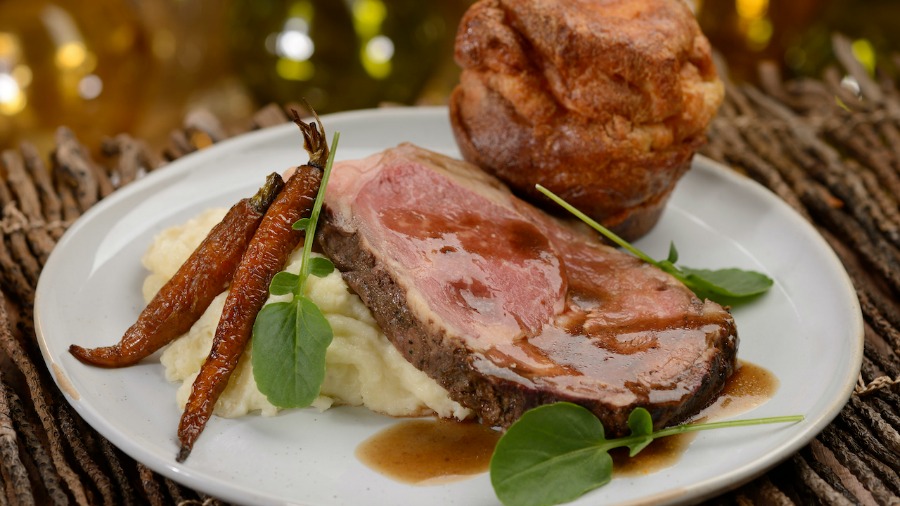 - Prime Rib (costela de boi) com purê de batata, cenouras e popover