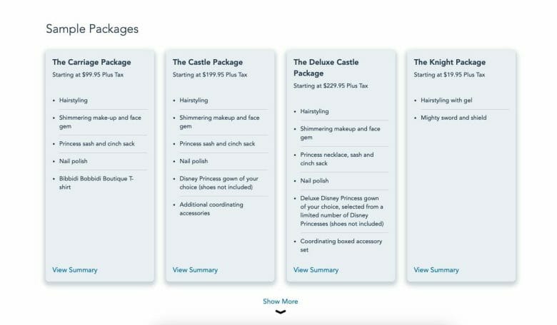 A Bibbidi Bobbidi Boutique oferece transformações em princesas e em cavaleiros para crianças de 3 a 12 anos. Para as transformações em cavaleiros, os preços começam em US$19,95 para o pacote mais simples e vão até US$79,95. Já para as transformações de princesas, o pacote mais simples custa US$99,95, e os preços vão até US$229,95 para os pacotes mais completos, com acessórios e fantasias deluxe.