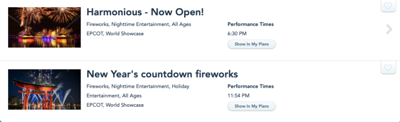 Já no Epcot, o show acontece apenas no dia 31 de dezembro, e os horários são os seguintes: