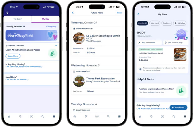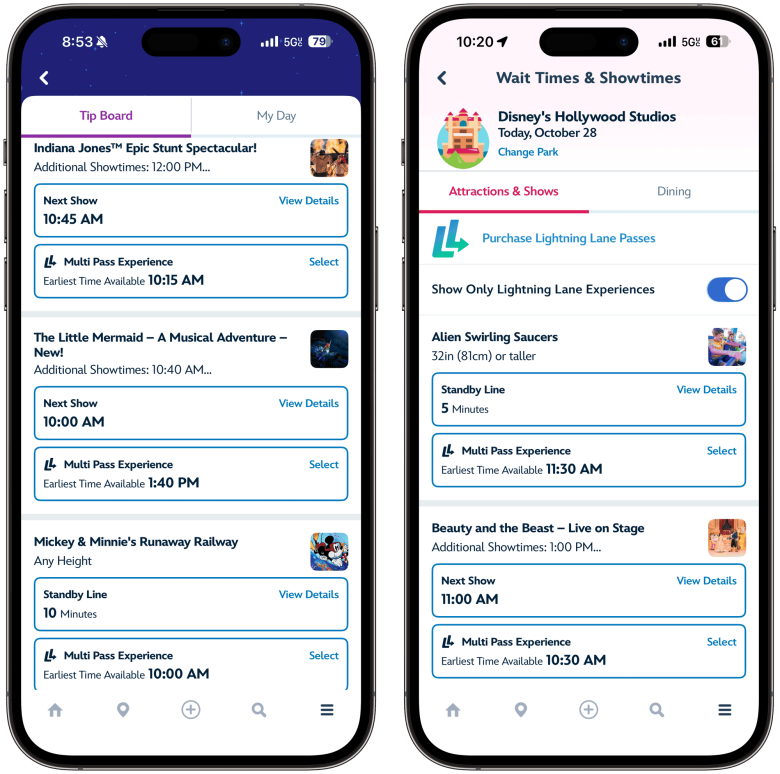 Além disso, o antigo Tip Board foi renomeado para Wait Times & Showtimes. Ali é possível dar uma olhadinha nos tempos de fila, horários de shows e agendamentos disponíveis para o Multi Pass e Single Pass. Antes da mudança, Tip Board e o My Day eram duas sessões de uma mesma página.