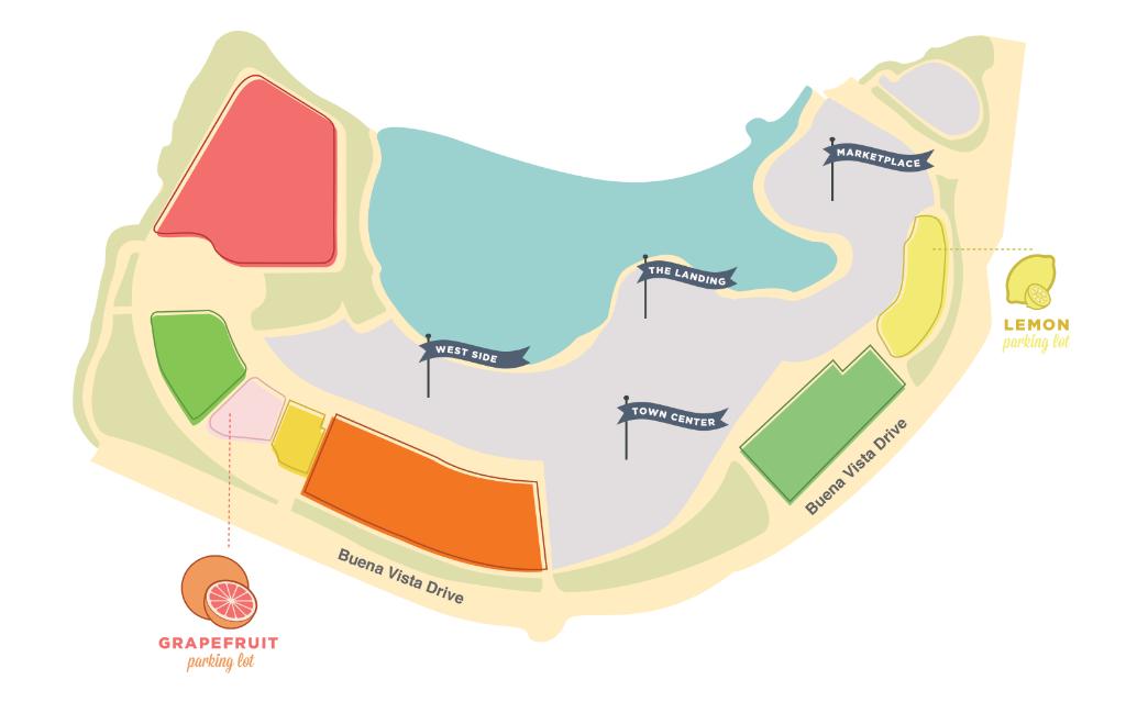 O estacionamento em Disney Springs é farto e gratuito, e agora estão sendo oferecidos duas áreas onde é possível estacionar o carro com mais comodidade e proximidade, ao preço de $10, um em cada ponta do complexo: o Lemon em Marketplace e o Grapefruit em West Side.