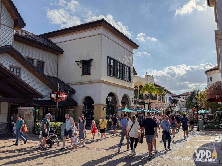 Por isso, uma dica que eu gostaria de dar é: evite os dias mais cheios do Disney Springs, ou seja, os finais de semana, principalmente o período da noite. Muita gente prefere visitá-lo à noite porque lá é um local mais aberto e, indo nesse horário, você não precisa caminhar com o sol da Flórida na cabeça. Além disso, consegue aproveitar para jantar e passear um pouco.