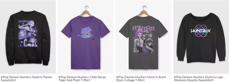 Aqui é o lugar onde você encontra a maior variedade de produtos das Guerreiras do K-Pop: camisetas, pijamas, brinquedos, pulseiras, acessórios, fantasias e até decoração de festa. Aqui embaixo você encontra alguns exemplos de produtos e seus respectivos links.