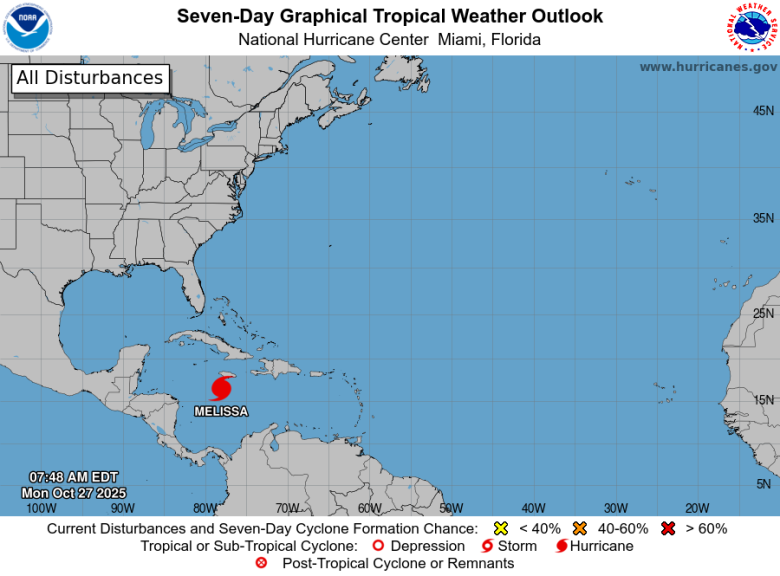 De acordo com o NHC, a tempestade está prevista para atingir a região da Jamaica entre essa segunda-feira, 27 de outubro de 2025, e terça-feira, 28 de outubro de 2025. Espera-se um alto volume de chuva e ventos que podem chegar a mais de 250 km/h.