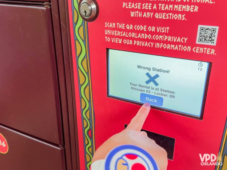 Quando você voltar da atração, basta ir até o mesmo computadorzinho, selecionar “Abrir armário” ou algo assim, colocar o número do armário e escanear seu ingresso novamente e pronto, o computador vai destrancar o seu armário. Mais uma vez: retire tudo que é seu de lá pois você não terá mais acesso a este armário depois, viu?