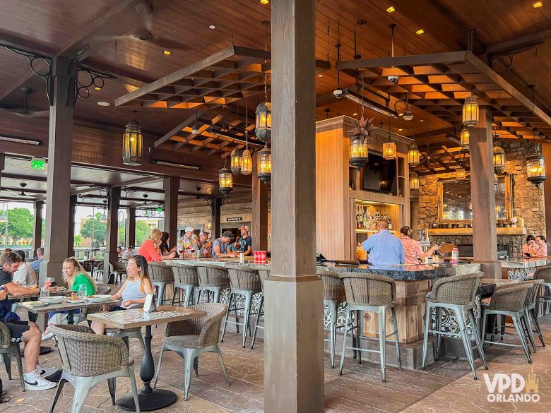 O Three Bridges Bar & Grill at Villa del Lago não aceita reserva, então vale chegar cedo se não quiser esperar muito. Uma outra alternativa é a Mobile Dine Walk-up Availability, a tradicional e velha fila de espera. Para entrar, basta acessar sua conta no My Disney Experience e buscar pelo restaurante. Aí é só selecionar quem do seu grupo estará na refeição com você e, assim que a sua mesa estiver pronta, você será avisado pelo próprio aplicativo. O único ponto de atenção aqui é que esse serviço funciona por geolocalização, ou seja, você precisa estar por perto para poder utilizar.