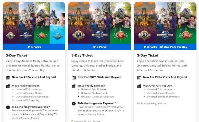 A principal novidade para o próximo ano são os ingressos de 3 dias que te permitem visitar o Epic Universe no mesmo dia que outro parque do complexo e mais de uma vez, uma opção que a gente não encontra disponível para compra em 2025.