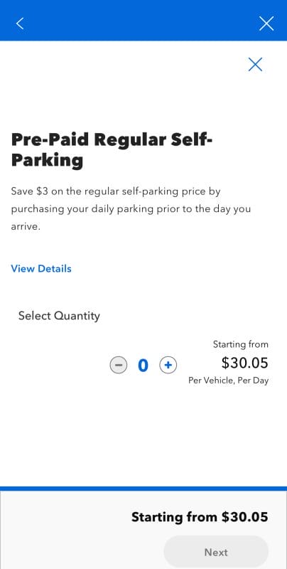 O estacionamento pré-pago custa US$30 dólares e, incluindo taxas e impostos, deve sair por aproximadamente US$32. Ou seja, você acaba economizando cerca de US$3 se comparar com o preço normal do estacionamento, que é US$35. Sei que o desconto é pequeno, mas qualquer economia é bem-vinda, né?